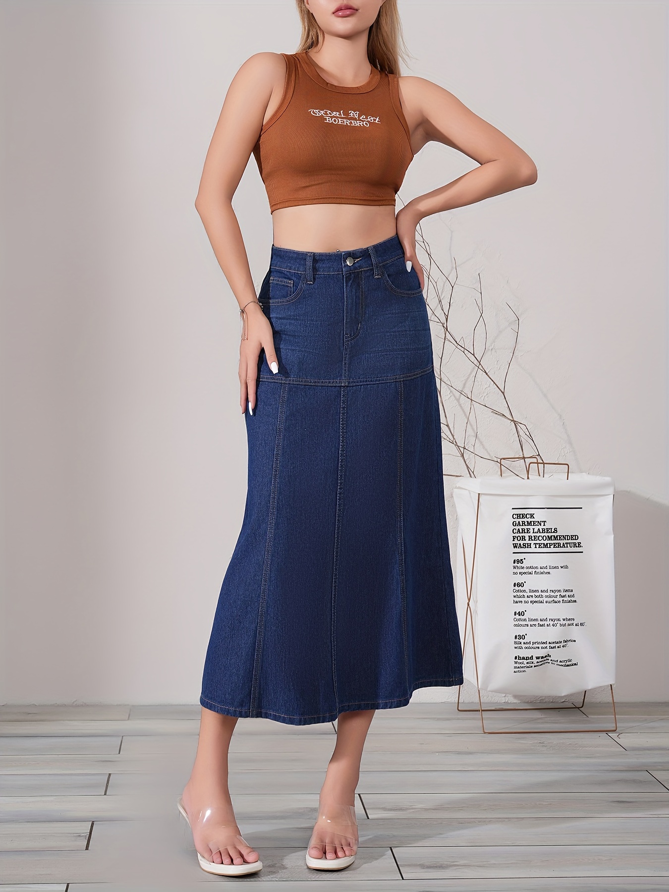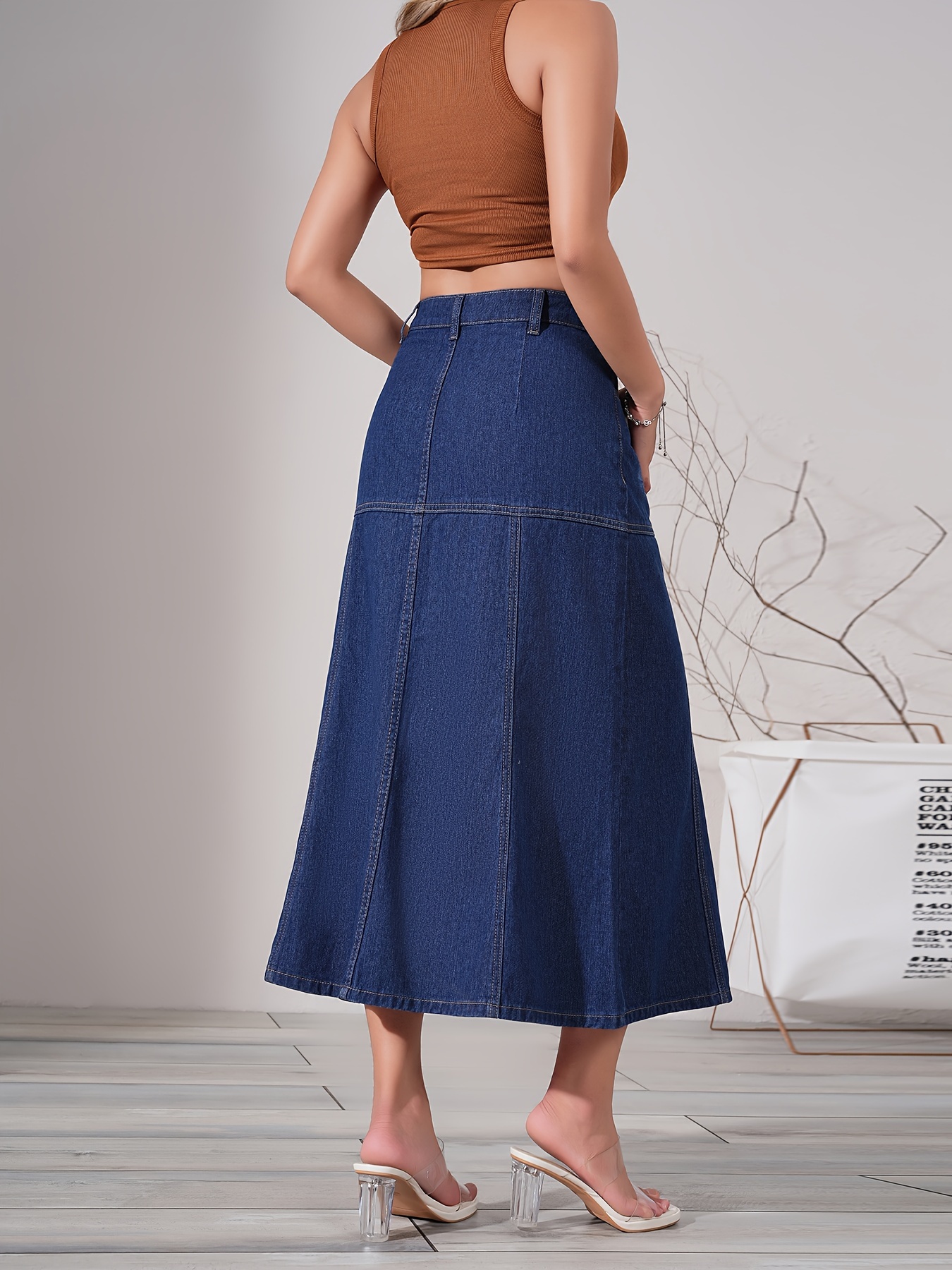 Dark Washed Women's Casual Midi Denim Skirt, Blue Jeans Style, Classic Fit