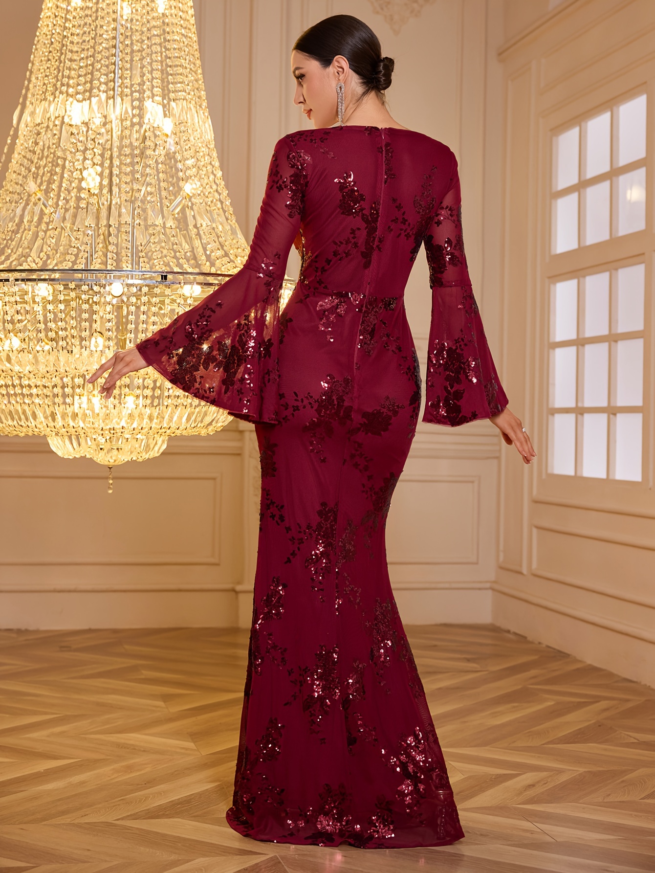Elegant Long Sleeve Deep V-Neck Sequin Mermaid Evening Gown, Polyester Bodycon Bridesmaid Dress with Chest Pad - Middle-Eastern Style Solid Color, Woven Fabric with Elastane for Comfort - Adult Collection