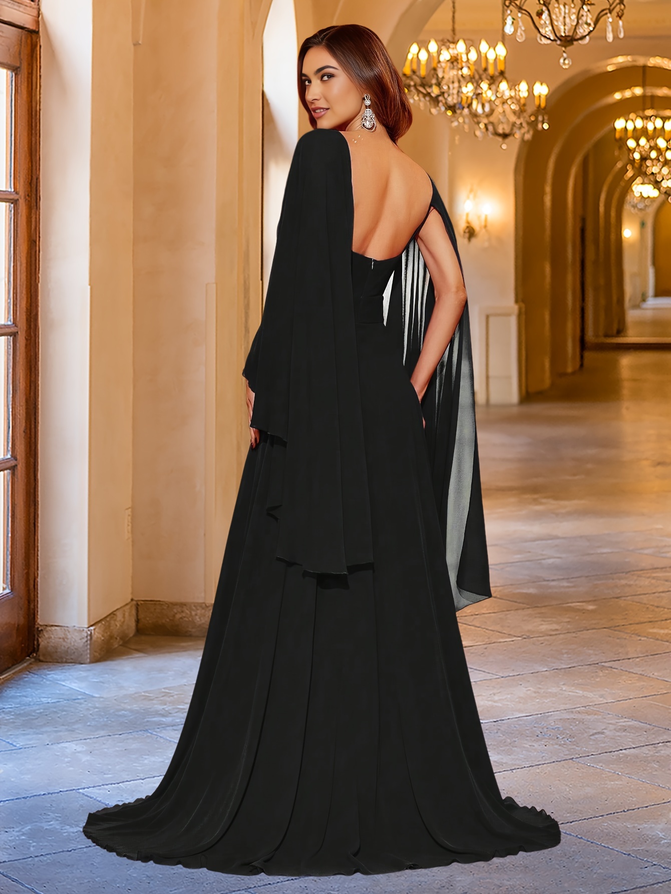 Elegant V-Neck Long Sleeve Sheer Shawl Dress with Exposed Back, Knit Fabric, A-Line Style, Solid Color, Super Long Length, All-Season Adult Dress