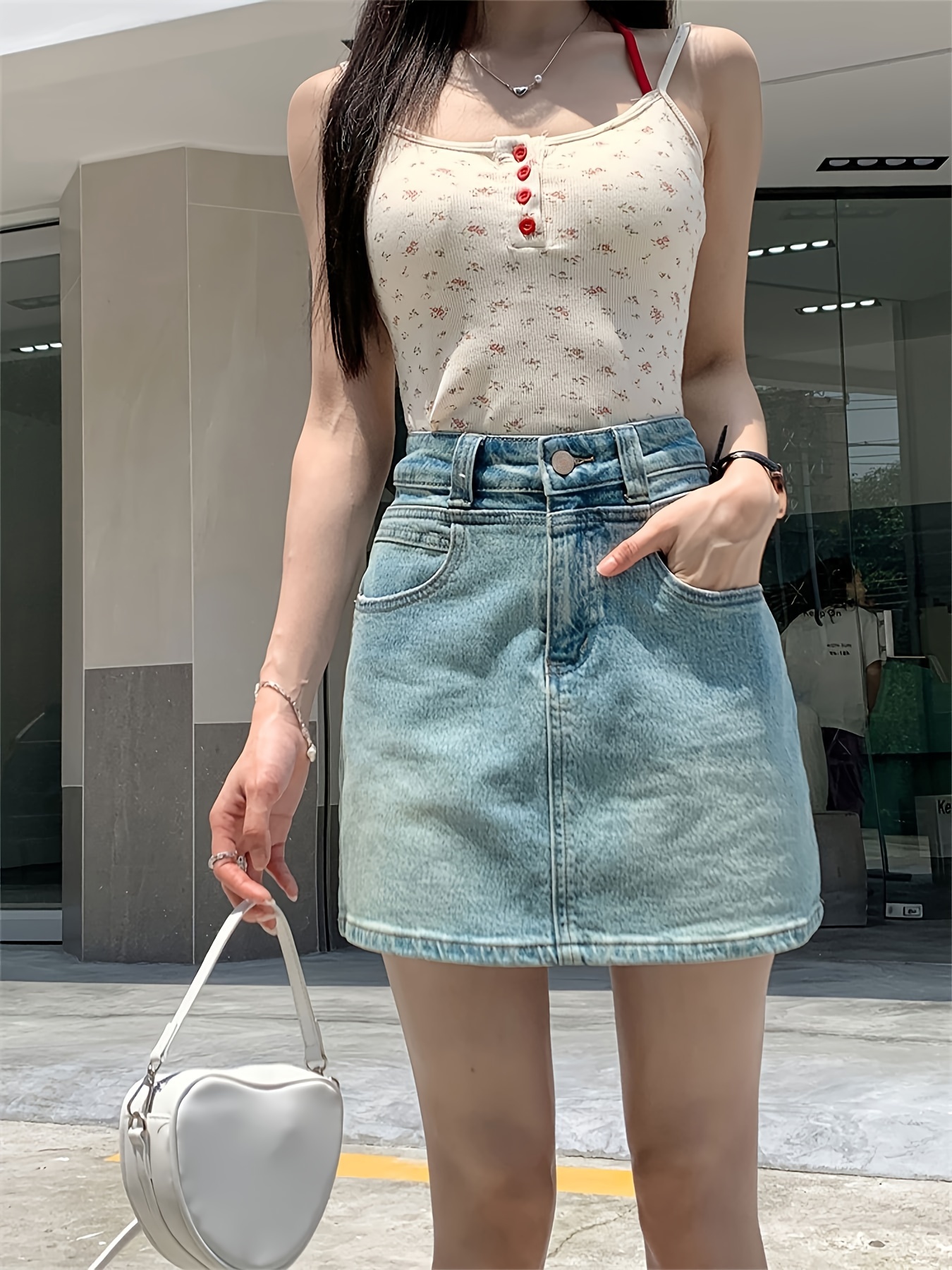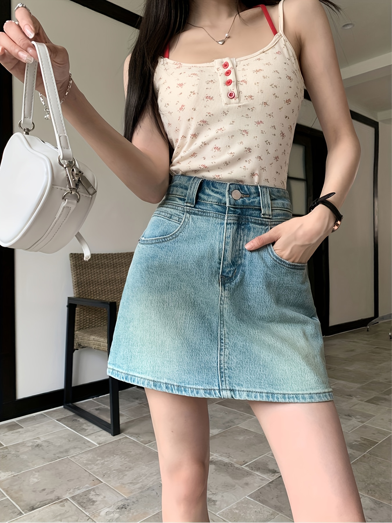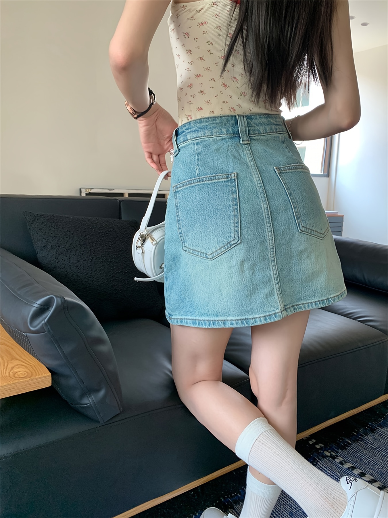 Plain Washed Blue High Rise Basic Style Mini Denim Skirt, Women's Denim Jeans & Clothing