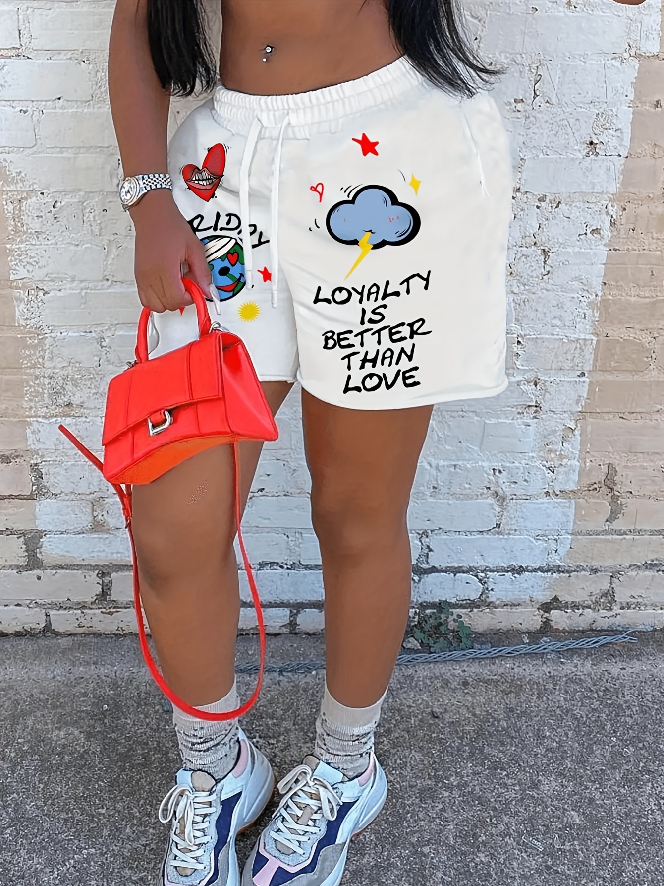 Vibrant Alphabet Print Knit Shorts - Elastic Drawstring Waist, Micro Elastic Polyester Fabric, Casual Style for Spring, Summer, and Fall - Womens High Waist Comfortable Shorts for Everyday Wear